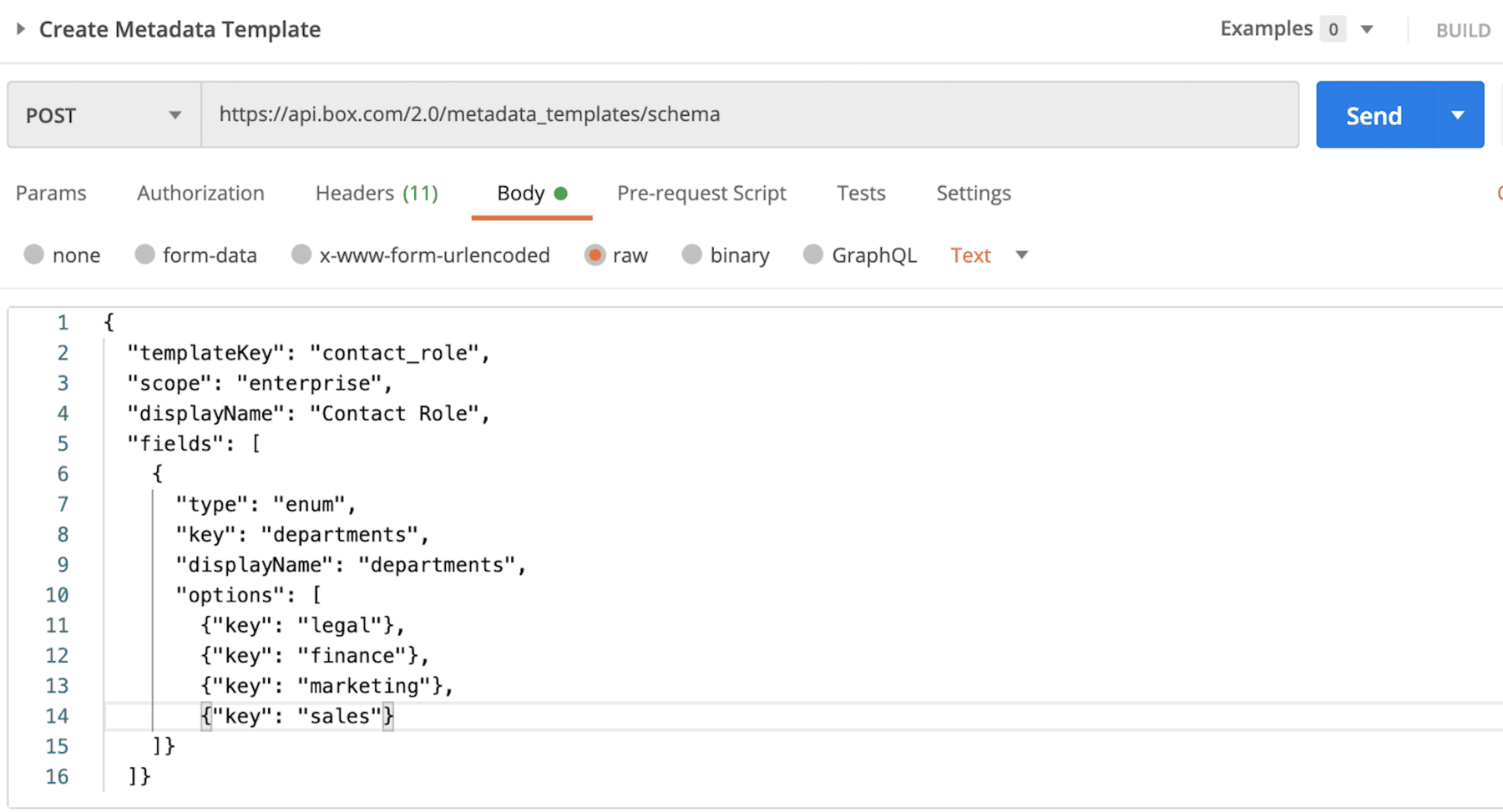 Using Postman and the Box Postman Collection, below is an example of what an API call looks like to create the same metadata template created above using the Admin Console.